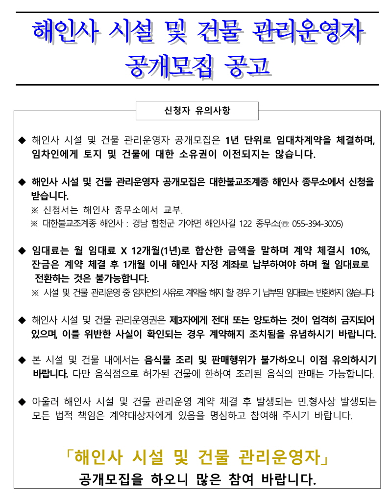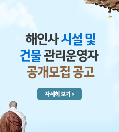 대한불교조계종 전국교구본사 입장문 해인사재적승기초수행비신청안내 청년객실 예약신청 팔만대장경 인터넷 사전예약제 신청 비로자나광명기도철야정진법회 가야산중봉마애미륵불기도법회 승보공양 해인사자원봉사자를 모집합니다.
