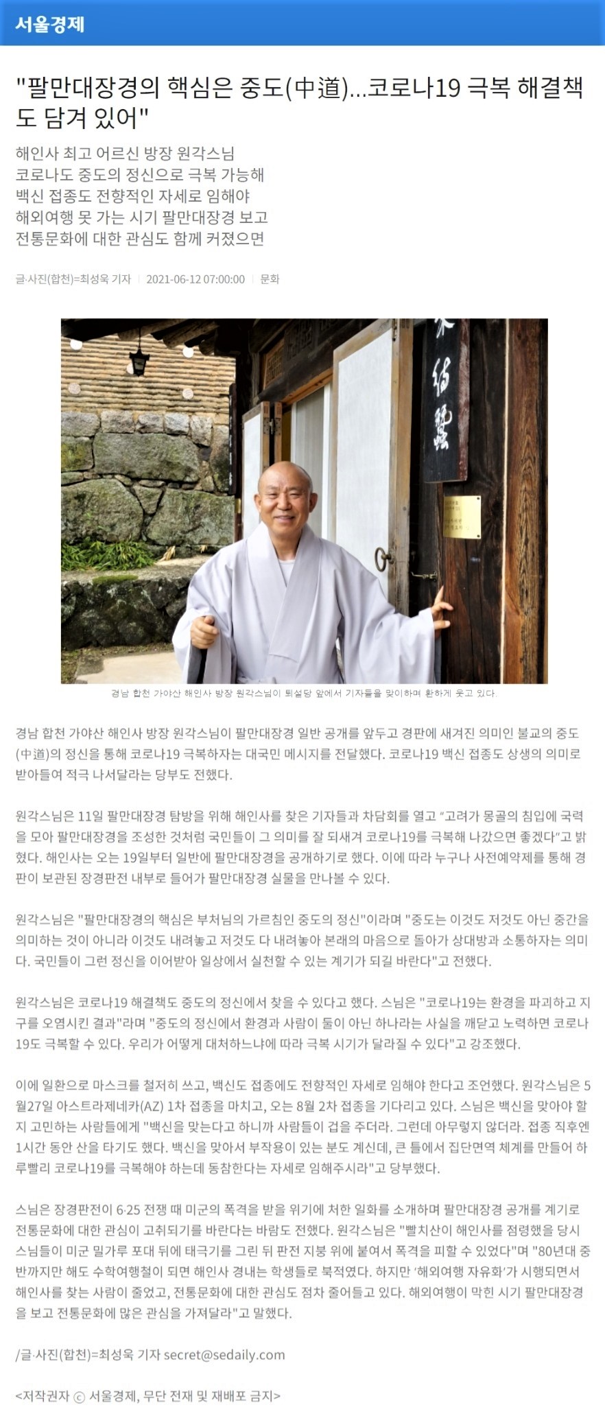 [서울경제] "팔만대장경의 핵심은 중도(中道)···코로나19 극복 해결책도 담겨 있어" 페이지 정보 작성자 관리자 작성일21-06-12 10:52 조회9,020회 댓글1건 본문 <원본 기사> https://www.sedaily.com/NewsView/22NLW45YXK 댓글목록 조주란님의 댓글 조주란 작성일 21-06-13 12:20 팔만대장경참관신청을 할려고 합나다 언제 어디로 신청하면 될까요 팔만대장경참관신청을 할려고 합나다 언제 어디로 신청하면 될까요 이전글 다음글 목록
